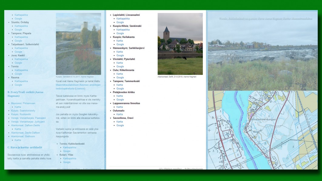 Maisema-analyysejä tai ympäristöekologian tehtäviä voit teettää materiaaleista, joissa on käytetty Karttapaikkaa, Googlen katunäkymää sekä Everytrail- retkiäni. Lisäksi olen tehnyt kuva-artikkeleja, joissa on yhdistetty samalle sivulle kartta ja sen alueelta ottamani kuva. Kun Maanmittauslaitos vapautti aneistonsa vapaasti käyttöön, huomasin siinä mahdollisuuden niiden hyödyntämiseen. Kartat olen siis tilannut Maanmittauslaitokselta ja editoitunut artikkeleihin sopiviksi. Esimerkki Tornion Kukkolankoskesta näkyy ohessa kuvankaappauksena.